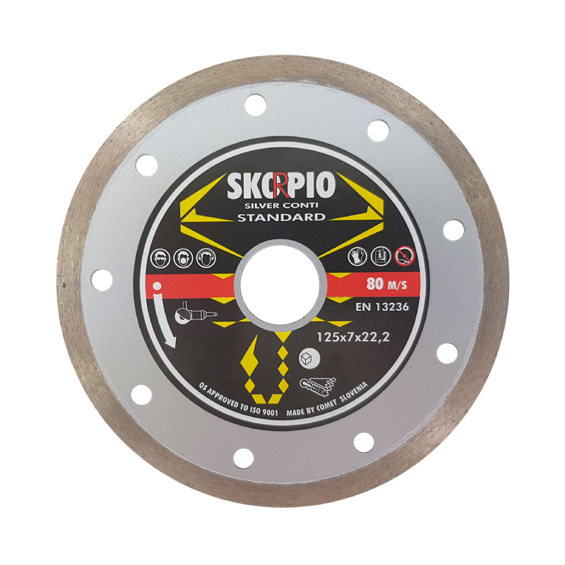 Diamond disc for angle grinder SKORPIO SILVER CONTI by SWATYCOMET for cutting granite tiles and ceramics. The diamond disk has dimensions of 125 x 22.2 mm and is suitable for work under heavy loads. The discs in this series are specially segmented for optimal cooling. It is not recommended to cut asphalt or abrasive materials.It is made by modern technology, which guarantees strength and quality.
