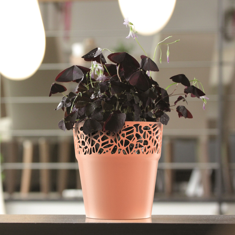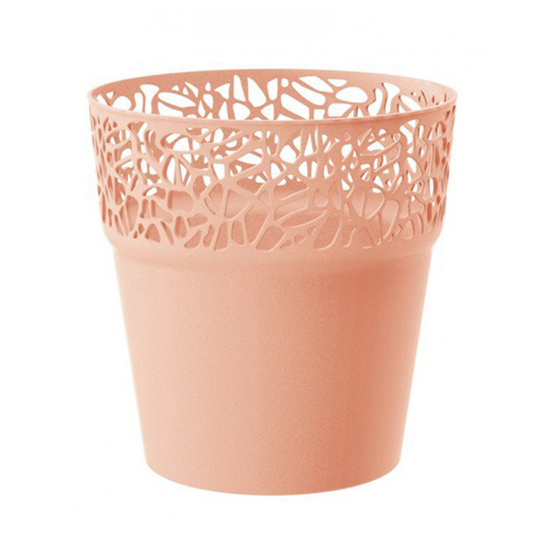 Stylish and quality pot from the Naturo series of the PROSPERPLAST brand. made of peach-colored plastic. Unbreakable, resistant to UV rays and weathering. The model features a braid of fine lines and classic shapes with imitation lace.