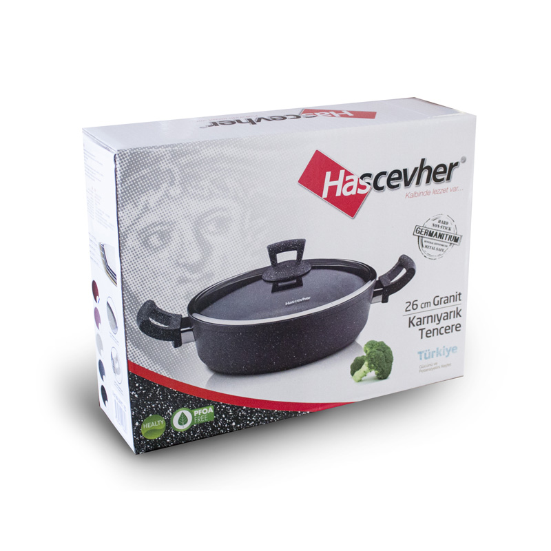 Braid pot from the Granite series of the HASCEVHER brand. Extremely suitable for healthy, fat-free cooking. It is made of cast aluminum with non-stick hard granite coating in gray. The high-quality bottom heats up very quickly and does not allow food to stick. The kitchen cooking vessel has a capacity of 3.9 liters and a diameter of 26 cm at a height of 7.5 cm and a thickness of 4 mm. The shallow pot has comfortable ergonomic handles made of bakelite. They do not heat up during cooking.