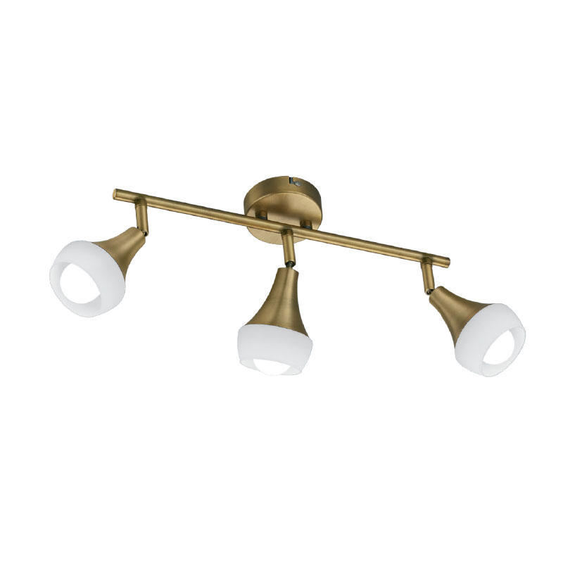Spotlight triple luminaire with dimensions 41 x 19. 5 x 9 cm, power 3 x 40W and socket 3 x E14. With its stylish, beautiful and modern design, the luminaire with directional light is suitable lighting for a corridor, bedroom, living room, living room, children's room or kitchen. The TRUMPET model from TRIO is made of matt brass metal, with a beautiful frosted glass shell for the lighting part. The Triple Spot has a degree of protection IP20, which does not allow its installation in rooms with high humidity levels. The TRUMPET triple directional luminaire has easily movable heads that allow easy light direction. The Triple Spot can be mounted on the ceiling in the room as additional or main lighting. Compatible with LED bulbs, energy saving bulbs and incandescent bulbs.It meets the EU requirements for safety and energy efficiency.