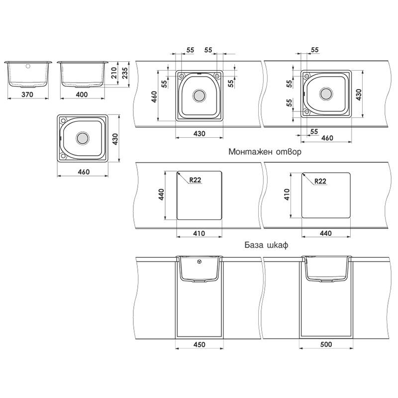 Einzel-Einbauspüle FAT aus Granixit, Maße 43 x 46 cm. Im Set enthalten ist ein hochwertiger italienischer Spülbeckensiphon mit der Größe Ф90 mm.