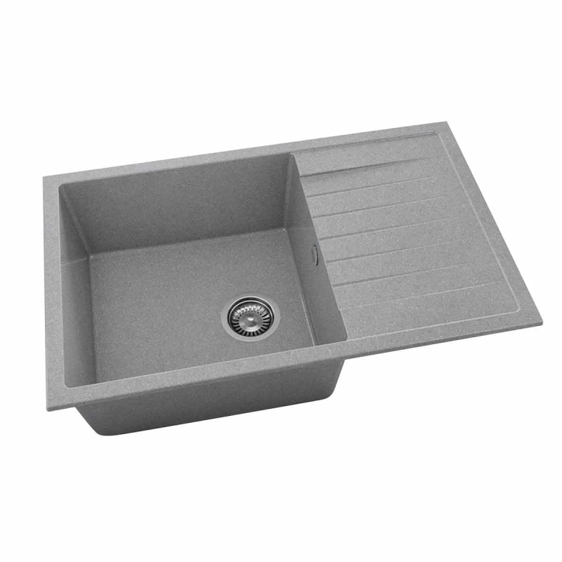 FAT Einbauspüle aus Polymermarmor, Größe 80 x 49 cm, mit der Möglichkeit, eine linke oder rechte Arbeitsplatte zu wählen. Das Set enthält einen hochwertigen italienischen Siphon mit einer Größe von 90 mm.