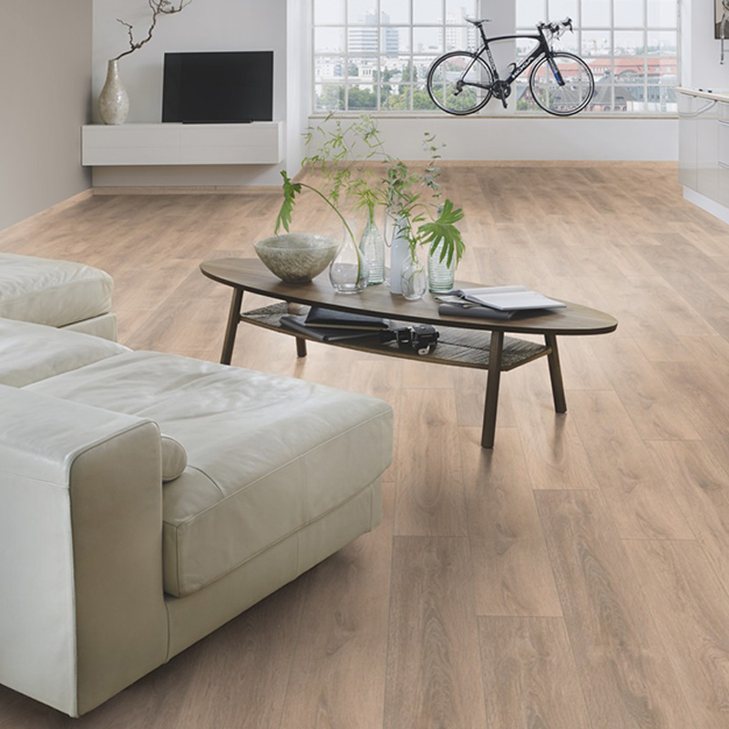 Laminate flooring has a four-sided click and antibacterial coating. Easy to clean and maintain. Laminated parquet KRONO ORIGINAL Super Natural Classic is impregnated against moisture, resistant to stains, stains and scratches.