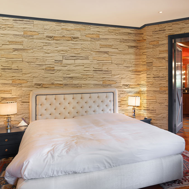 The natural shades of artificial stone can also be an ideal background for bold accents. The decorative stones themselves can be painted in different colors and give uniqueness to the room. They take much less time to install than natural stone.