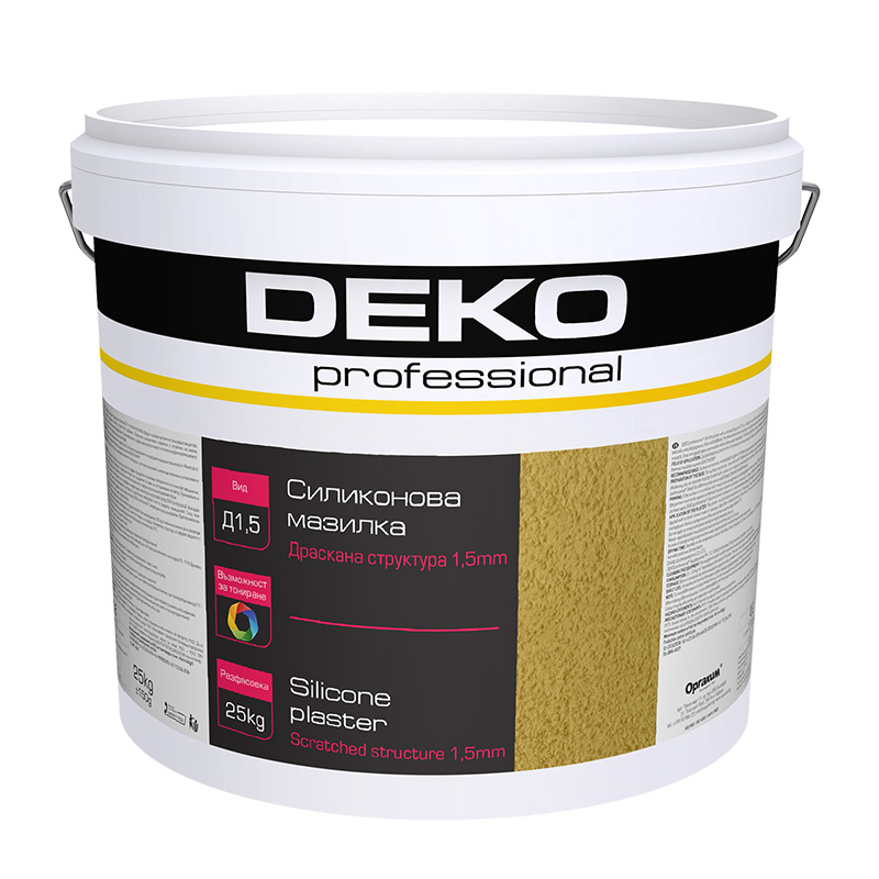 DEKO professional Silicone plaster with scratched structure D1.5 is a ready-to-use paste plaster based on organic binder, silicone emulsion and specially selected pigments, fillers and additives. For indoor and outdoor use.