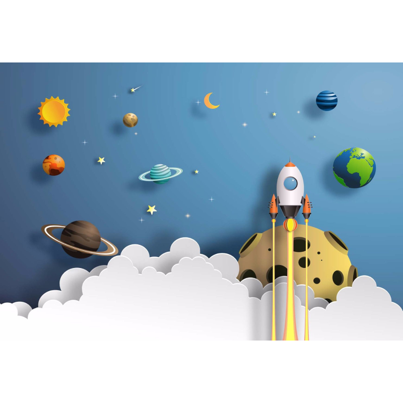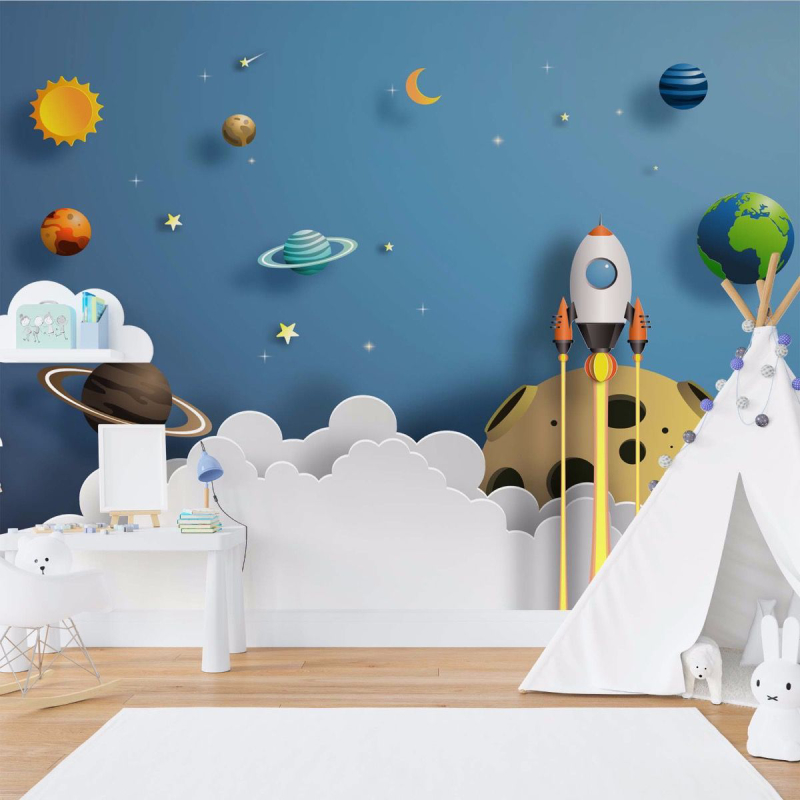 High quality photo wallpaper for children's room with Rocket Away image. Photo wallpaper is suitable for placing the wall in any room that is not exposed to high levels of humidity.