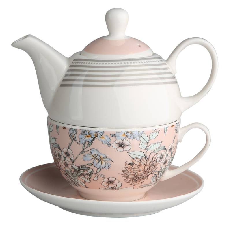 Tea set including teapot, cup and saucer. Dishwasher safe. All parts of the set are made of high quality porcelain. Offers elegant and original design. Combines perfectly with the rest of the kitchen utensils of the same series.
