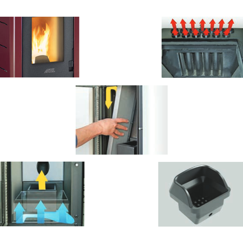 The air jet on the side is designed to aid combustion and also clean the glass. The inner wall of the combustion chamber covers the ducts intended for the passage of the exhaust gases. It can be easily dismantled in 3 steps for easier flue cleaning.
