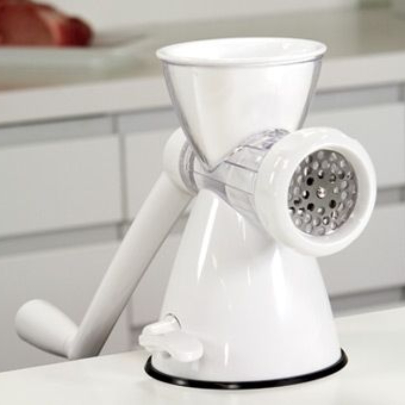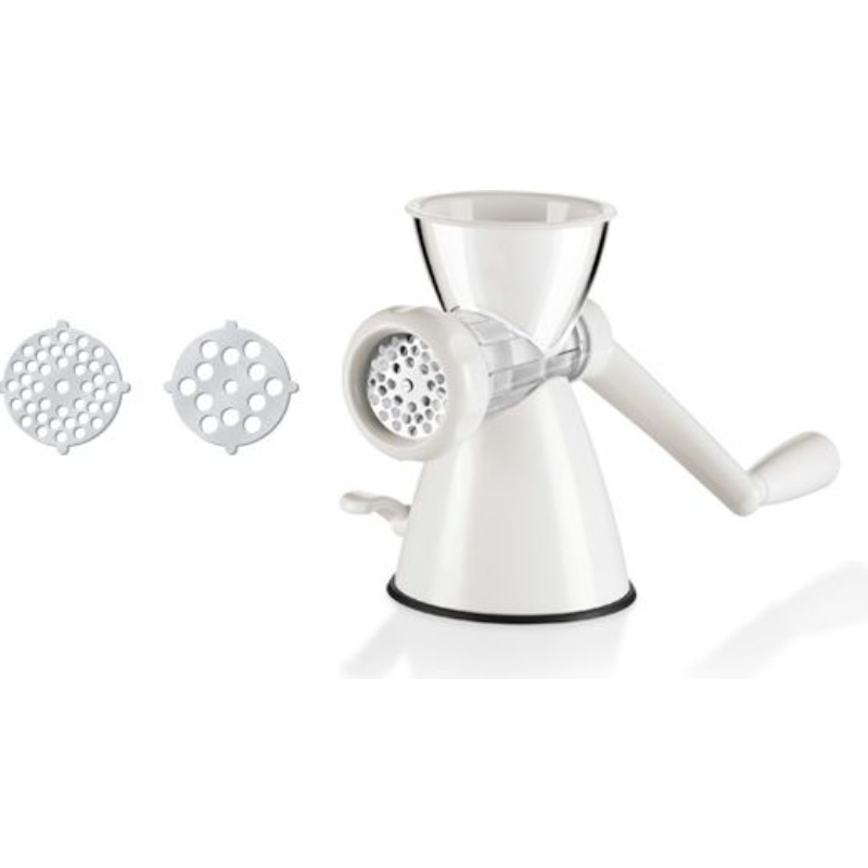Mit diesem modernen, kompakten und zuverlässigen Handgerät können Sie mühelos sowohl Fleisch als auch viele andere Produkte mahlen: Semmelbrösel, Hartkäse, Knoblauch, Zwiebeln, Nüsse, Gemüse usw. Dank zweier auswechselbarer Roste wählen Sie den Mahlgrad – fein oder grob.