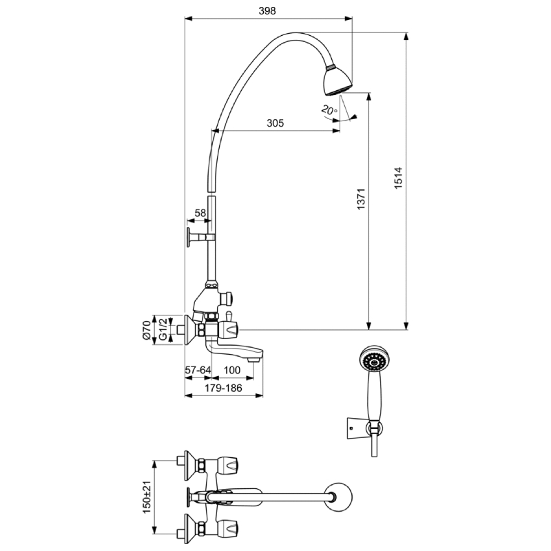 The wall-mounted bath/shower mixer from the Iskar series by VIDIMA is available complete with a top stationary shower and a mobile hand shower. The faucet has G1/2" rubber closing mechanisms and a cast spout.The wall-mounted bathroom faucet is two-handle with hot and cold water indication. It has a manual bath/shower switch and a Perlator aerator, which will save water.The VIDIMA mixer is mounted via a standard connection.