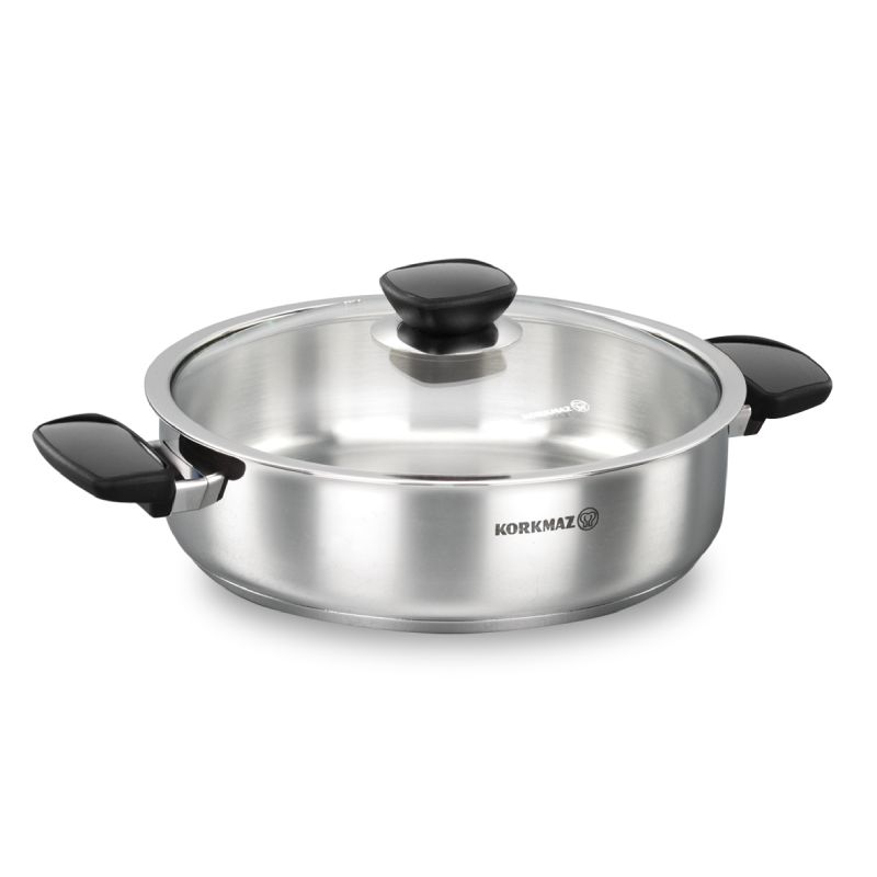 Shallow pot from the Kappa series by KORKMAZ with dimensions ф24 x 6.5 cm and capacity 2.8 l. The body of the pot is made of high quality chrome-nickel stainless steel Cr-Ni 18/10. The lid is transparent - made of heat-resistant glass and has a comfortable handle made of bakelite. The comfortable handles of the pot are also made of bakelite and are heat resistant.