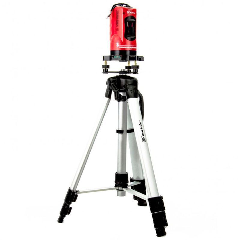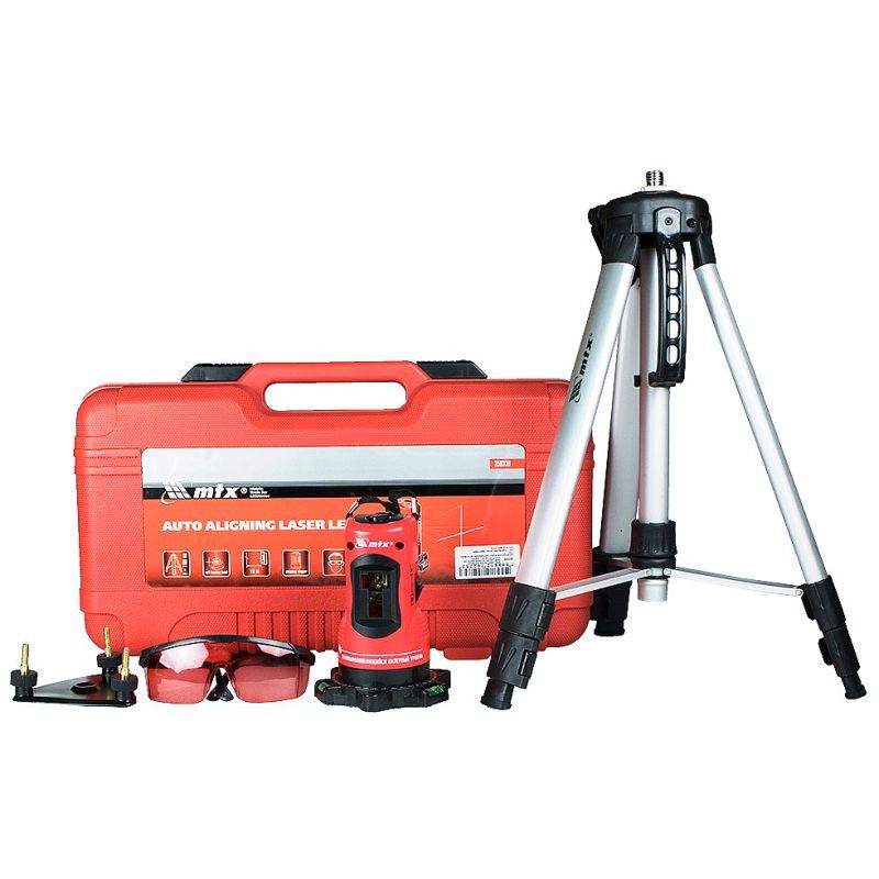MTX laser level with crossed lines and a range of 10 meters. The laser level has a base that allows 360°rotation. The set also includes a professional tripod with a maximum height of 110 cm, goggles, batteries and a storage case.