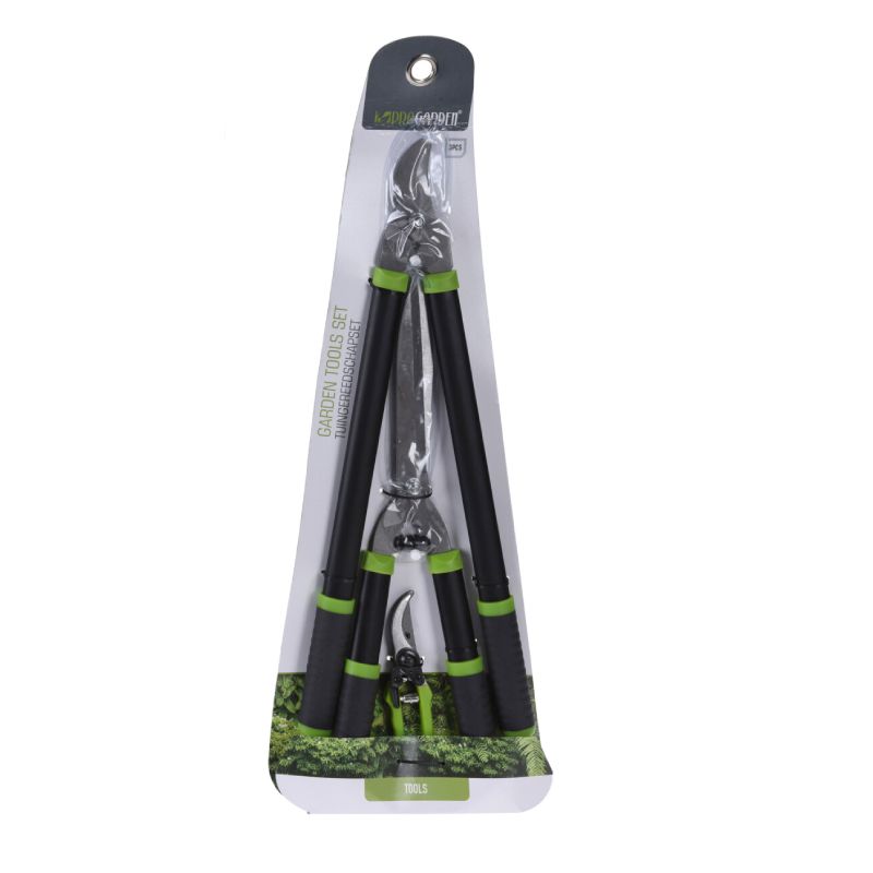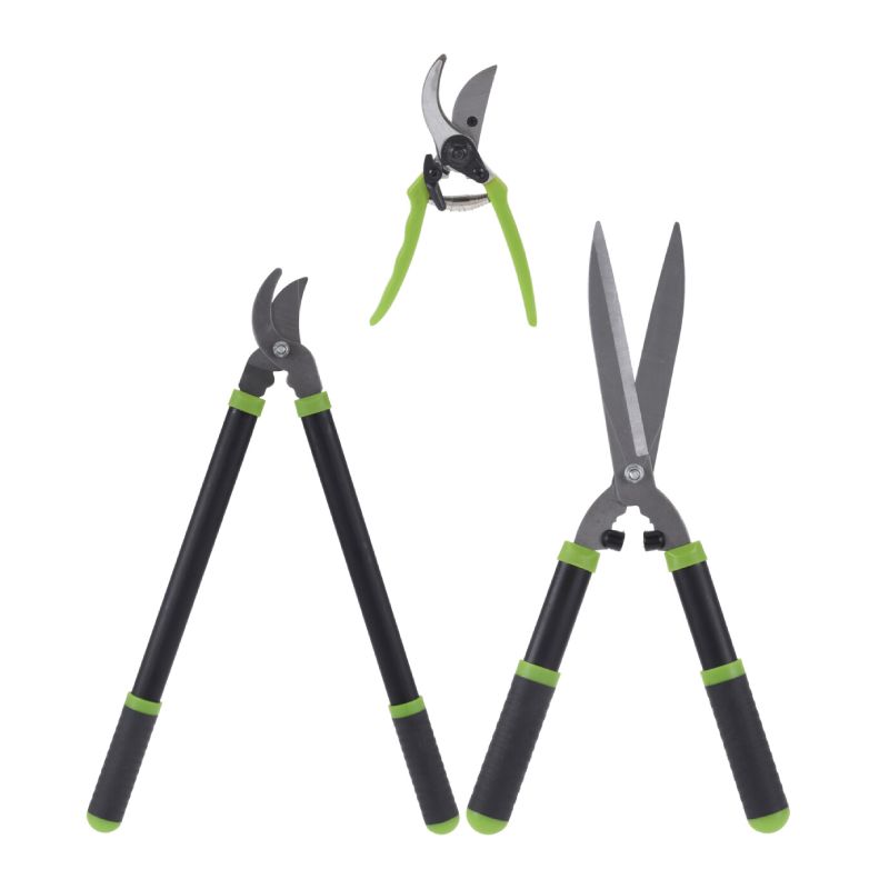 Set of 3 garden shears for all needs related to pruning trees and shrubs. The set includes scissors for pruning shrubs, scissors with long handles for pruning branches, as well as pruning shears.