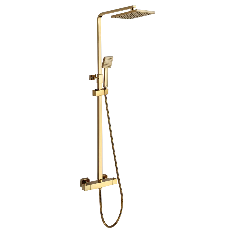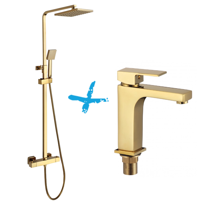 Bathroom set INTER CERAMIC 6222 Gold + 1008866, including shower system with thermostatic mixer and standing mixer tap for sink. The thermostatic shower mixer, as well as the sink mixer, are made of high-quality stainless steel with a non-heating body and a gold-colored protective coating.