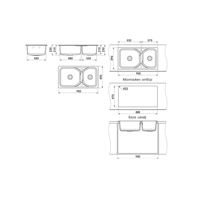 FAT Einbauspüle aus Polymermarmor, 90 x 49 cm, mit zwei Becken. Das Set enthält einen hochwertigen italienischen Siphon mit Ф90 mm.