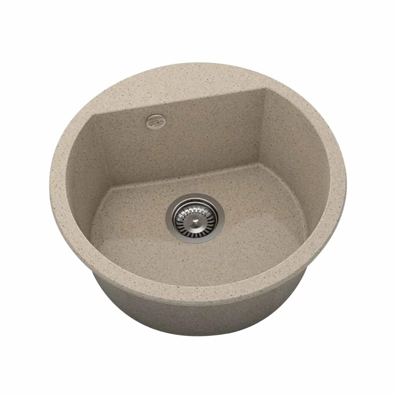 Eine runde Küchenspüle mit Rand der Marke FAT – zum Einbau. Aus Polymermarmor mit einem Durchmesser von 51 cm. Das Set enthält einen hochwertigen italienischen Siphon mit einer Größe von 90 mm.