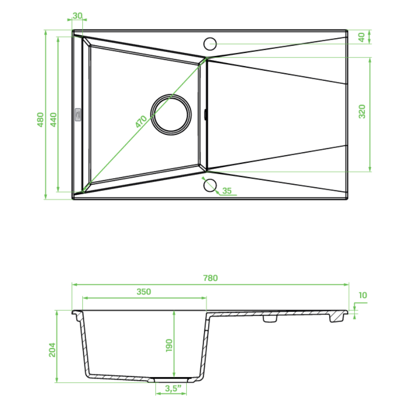 - Muldengröße: 350 x 320 x 440 mm, Diagonale 470 mm