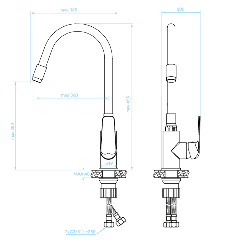 - Gesamthöhe des Mischers: 455 mm
