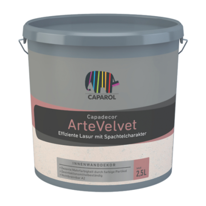 Capadecor ArteVelvet ist eine dekorative Innenbeschichtung (Lasur) mit einzigartigem optischen Effekt. Sie basiert auf einer wasserbasierten Acryldispersion und wurde speziell für elegante und kunstvolle Wand- und Deckenbeschichtungen entwickelt. Dank der eingebetteten hellen Pigmentpartikel, die der Oberfläche optische Tiefe und Dynamik verleihen, besticht sie durch einen außergewöhnlichen optischen Effekt. Das Produkt ist für anspruchsvolle Innenräume konzipiert – vom Wohnbereich bis hin zu luxuriösen öffentlichen Räumen, in denen Design im Mittelpunkt steht. Die weiche, samtige Textur und das satinierte Finish vermitteln ein Gefühl von Eleganz und Behaglichkeit und bieten gleichzeitig eine hervorragende Verschleißfestigkeit.