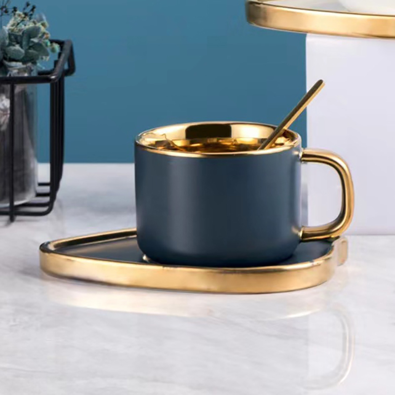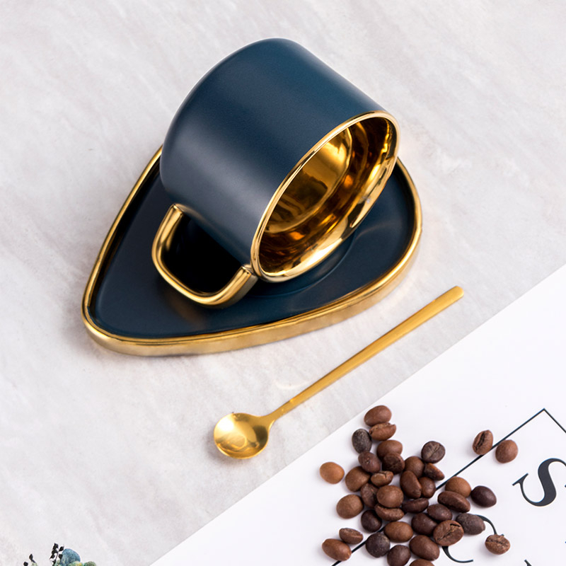 Ein elegantes Service, das edles Design mit modernem Stil verbindet. Die Tasse hat eine klassische Form und ein mattblaues Finish, während der zarte Goldrand ihr ein edles Finish verleiht. Das Highlight ist die blattförmige Untertasse, die einen künstlerischen Touch verleiht und die Einzigartigkeit des Sets unterstreicht. Der zusätzliche Löffel macht das Set komplett und funktional.