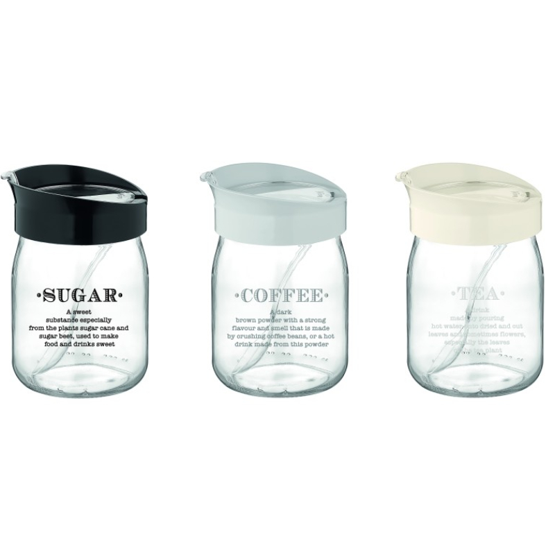 Das Set umfasst drei Gläser mit unterschiedlich farbigen Deckeln – schwarz, weiß und grau –, die der Küchentheke oder dem Regal einen modernen und harmonischen Look verleihen.