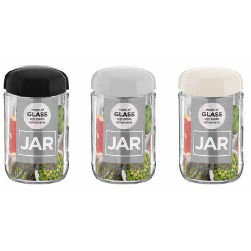 Die Kombination aus klarem Glas und schlichtem Design ermöglicht eine einfache Kombination mit anderen Gefäßen der Rhea-Serie. Erhältlich mit schwarzem, weißem oder grauem Deckel; die Farbe wird je nach Verfügbarkeit zufällig ausgewählt.