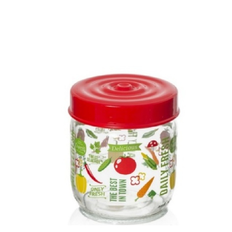Es eignet sich zur Aufbewahrung von Gewürzen, Kaffee, Zucker, Mehl, Reis und anderen trockenen Lebensmitteln. Das farbenfrohe Gemüsedekor sorgt für Gemütlichkeit und eine angenehme Atmosphäre, und das Glas lässt sich problemlos mit anderen Größen derselben Serie kombinieren, um einen harmonischen und aufgeräumten Küchenstil zu erzielen.