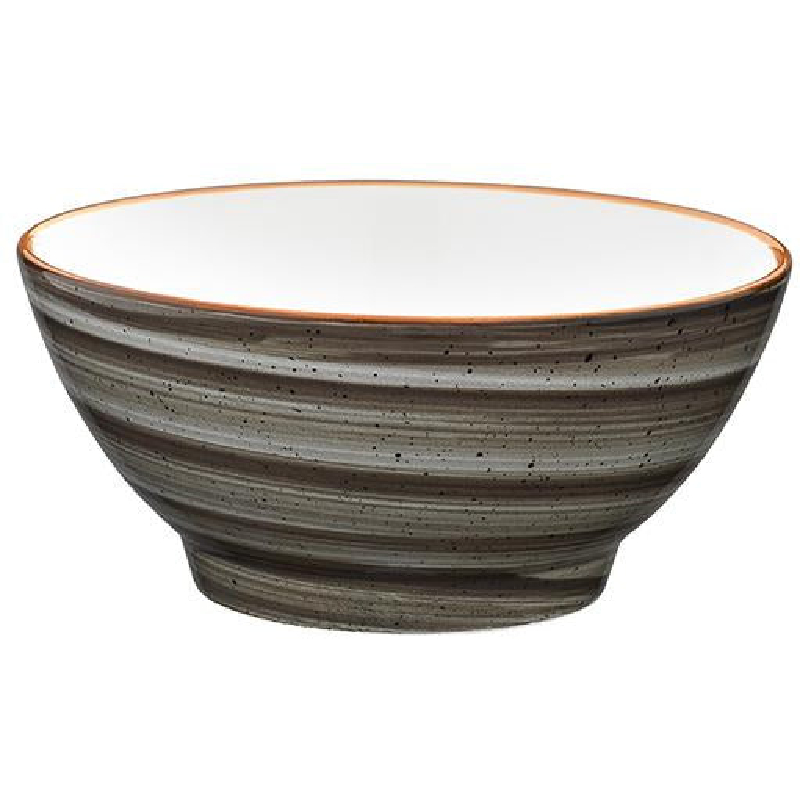 Die Bonna Space-Schale mit einem Durchmesser von 14 cm und einem Volumen von 450 ml ist Teil der anspruchsvollen Aura – Space-Kollektion, die von natürlichen Texturen und Erdtönen inspiriert ist. Die Außenseite weist ein kunstvoll gemaltes braungraues Muster mit feinen Punkten und Nuancen auf, das an handgemachte Keramik erinnert, während die Innenseite elegant weiß bleibt und durch einen zarten orangefarbenen Rand Akzente setzt.