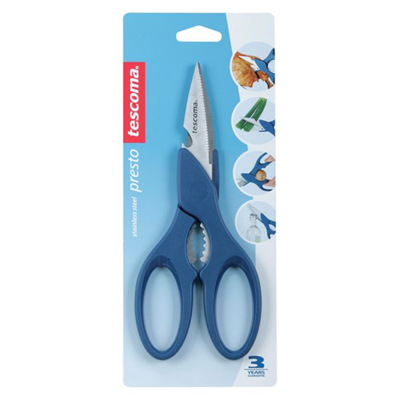 Die Tescoma Presto Multifunktionsschere ist ein vielseitiges Werkzeug, das mehrere nützliche Funktionen in sich vereint. Ein unverzichtbares Werkzeug in jeder Küche. Sie eignet sich zum Schneiden von Hühnchen, Verarbeiten von Gemüse, Öffnen von Flaschen, Knacken von Nüssen und sogar zum Schneiden von Papier oder Textilien. Robust, bequem und präzise – diese Schere werden Sie täglich benutzen.