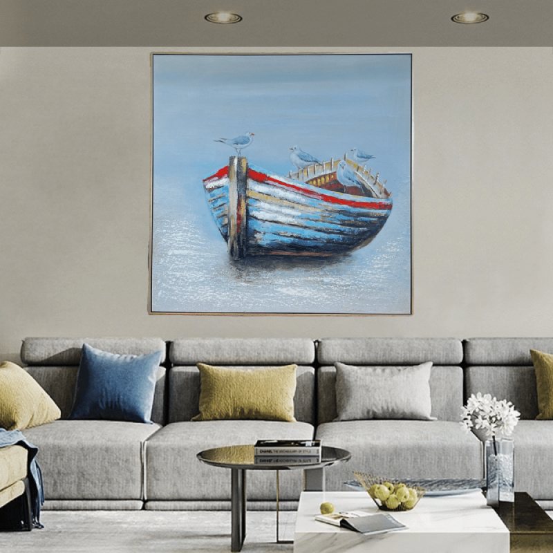 „Glarus und ein Boot auf dem Meer“ ist ein exquisites Gemälde, das die Stille und Harmonie der Meereslandschaft einfängt. Die sanften Blau- und Weißtöne verschmelzen harmonisch mit Grau- und Beigetönen und erzeugen ein Gefühl von Weite, Frische und Zeitlosigkeit. Der dezente rote Akzent verleiht der Komposition Tiefe und Charakter, ohne die Ausgewogenheit und Ruhe zu stören.