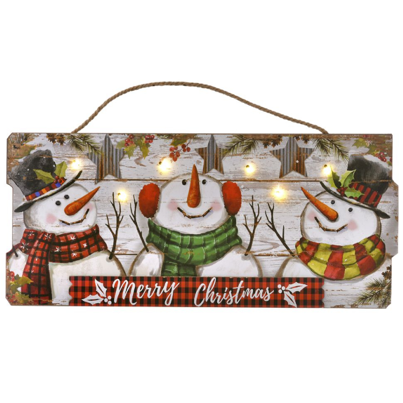 - Dekorative rechteckige Holztafel mit lächelnden Schneemännern und der Inschrift „Frohe Weihnachten“