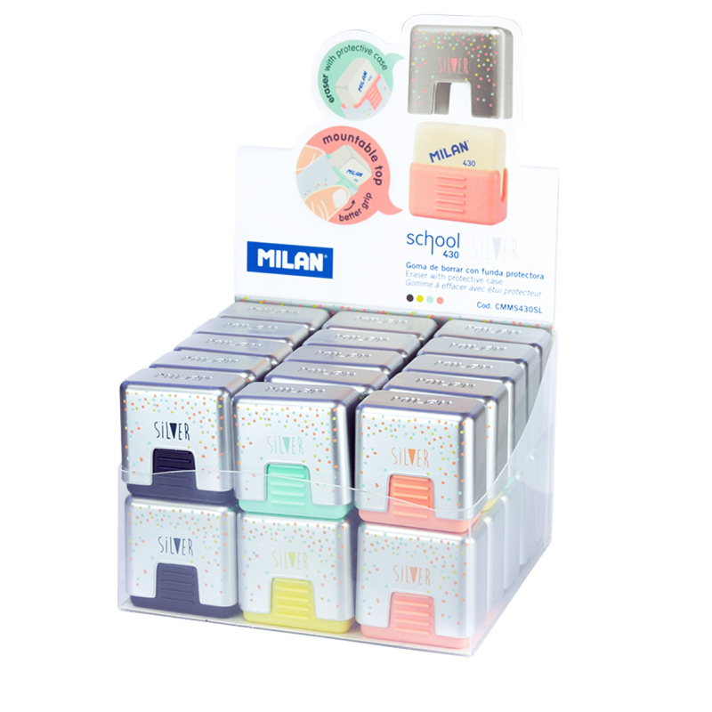 Der Milan Silver Radiergummi ist ein hochwertiger Radiergummi mit Schutzhülle, der zum präzisen Radieren von Graphitlinien auf verschiedenen Papiersorten entwickelt wurde. Der weiche Gummikörper gewährleistet effektives Radieren ohne Beschädigung des Papiers, und die Schutzhülle sorgt für Sauberkeit und Komfort beim Transport.