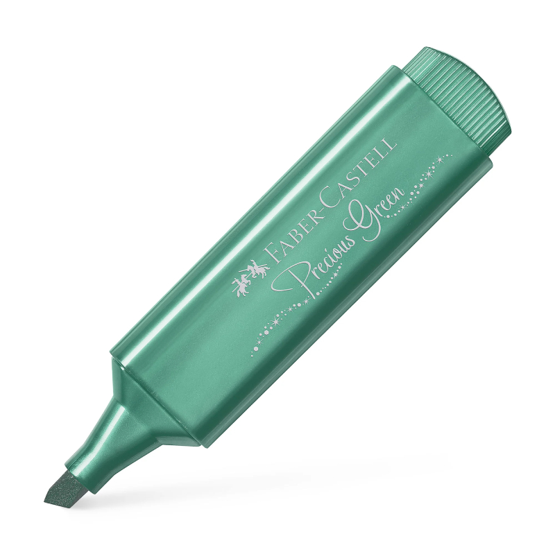 Der Faber-Castell 1546 Metallic-Textmarker in Grün verleiht markiertem Text Glanz und einen dezenten Glitzereffekt und eignet sich daher ideal für kreative Projekte, Notizen und Akzente in Dokumenten. Die Tinte auf Wasserbasis sorgt für sauberes Markieren, ohne das Papier zu durchdringen.