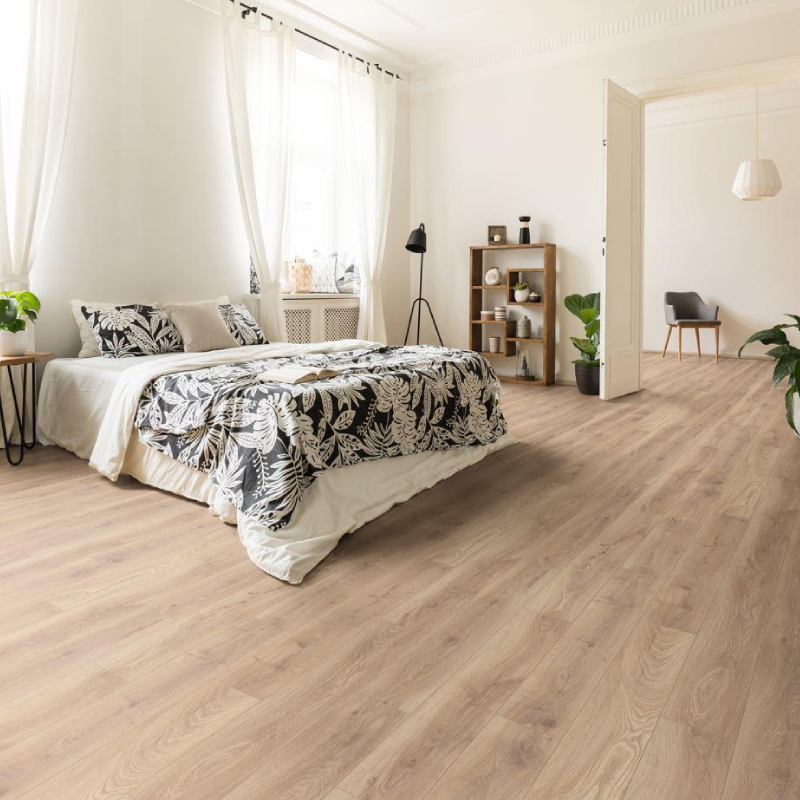Der Laminatboden K453 Bischotti Oak aus der Kollektion Atlantic MO.RE besticht durch seine natürliche Optik und den hellen Beigeton, der jedem Interieur Großzügigkeit und Eleganz verleiht. Er verbindet modernes Design mit Zuverlässigkeit und Pflegeleichtigkeit. Dank der Moisture Resistant-Technologie bietet der Bodenbelag eine bessere Feuchtigkeitsbeständigkeit und die vierseitige Fase sowie die authentische Struktur betonen die natürliche Optik des Holzes.