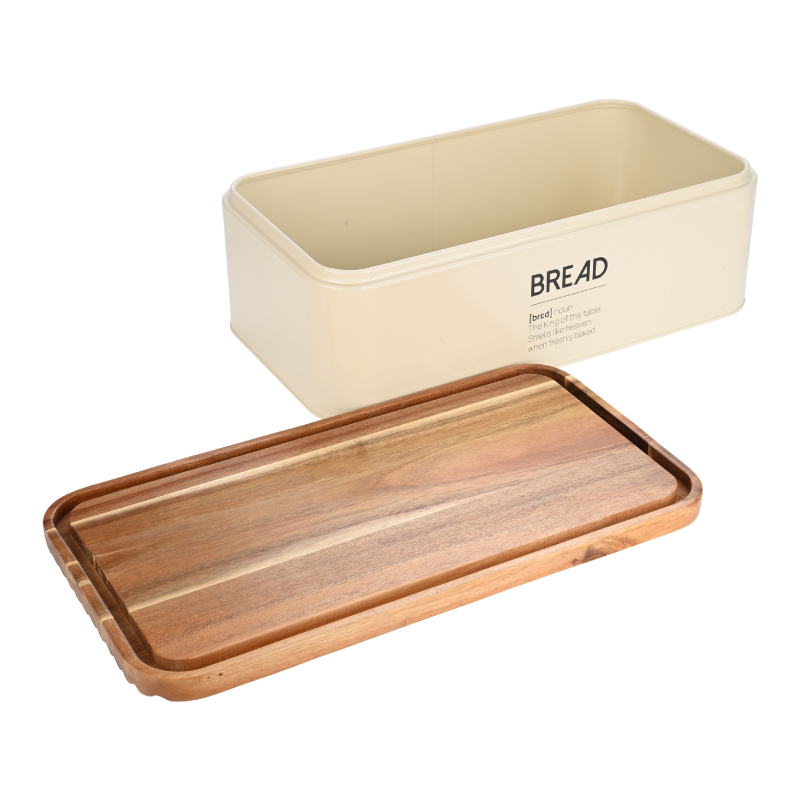 Stilvoller und praktischer Brotkasten aus Metall mit langlebiger Oberfläche in elegantem Elfenbein. Hält Brot und Gebäck länger frisch und trägt gleichzeitig zur Gemütlichkeit und Ästhetik der Küche bei.