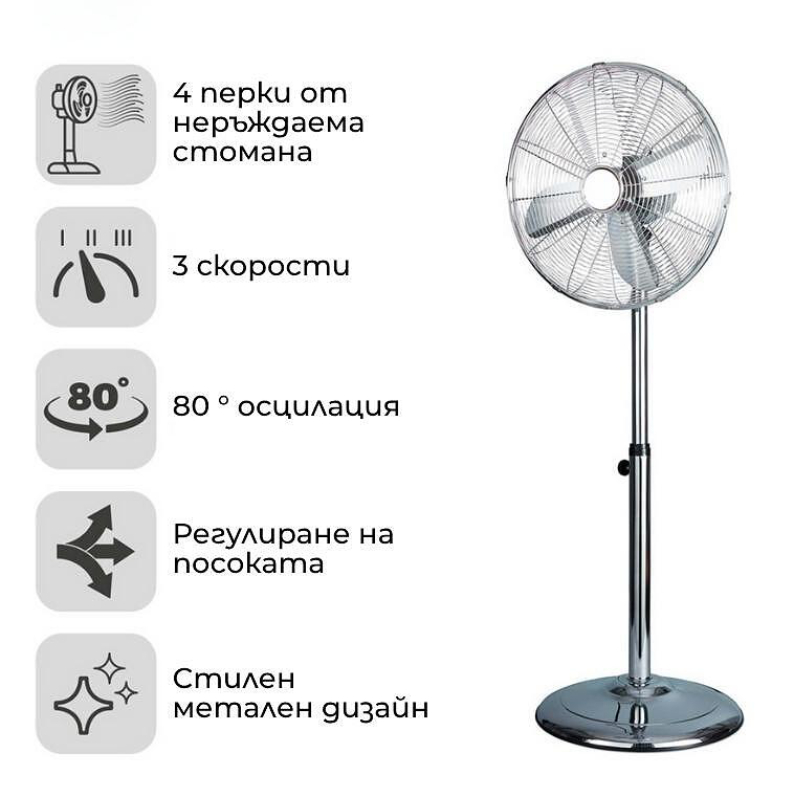 Mit einem großen Flügeldurchmesser von 46 cm und vier Metallflügeln sorgt der Ventilator für eine kraftvolle und gleichmäßige Luftverteilung, die ein angenehmes Kühlegefühl garantiert. Das Schutzgitter und der stabile Standfuß erhöhen die Nutzungssicherheit und die Standfestigkeit des Geräts. Finlux FSF-1813-SS ist die ideale Lösung für Zuhause und das Büro und sorgt jederzeit für Komfort und Frische.