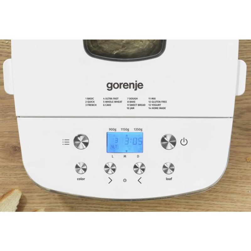 Der Brotbackautomat Gorenje BM1350W ist ein vielseitiges Gerät für die Herstellung von selbstgebackenem Brot, das Komfort, Funktionalität und eine große Auswahl an Optionen vereint. Mit einer Leistung von 750 W und 14 voreingestellten Programmen, darunter für Weißbrot, Vollkornbrot und glutenfreies Brot, Marmelade, hausgemachten Joghurt, Gären und Schnellbacken, ist er für jeden Geschmack und Bedarf geeignet. Die beiden antihaftbeschichteten Rührbesen sorgen für gleichmäßiges Kneten und die automatische Zugabe von Körnern, Nüssen oder Trockenfrüchten erfolgt im günstigsten Moment des Backvorgangs. Sie können zwischen drei Brotgrößen wählen – von 900 g bis 1350 g – sowie mit der CrustChoice-Funktion den Bräunungsgrad der Kruste – von hell und weich bis dunkel und knusprig. Durch das Sichtfenster können Sie den Vorgang überwachen und ein Tonsignal benachrichtigt Sie über die Zugabe weiterer Zutaten.