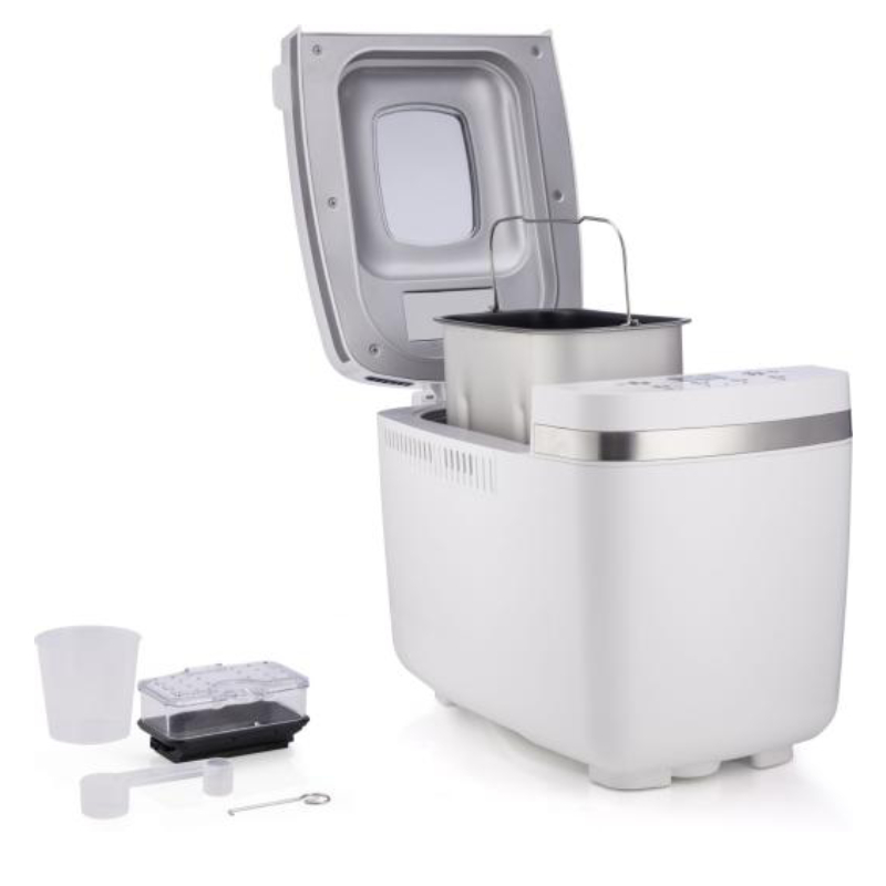 Das Gerät ist mit einem praktischen LCD-Display und elektronischer Steuerung, einem Ein-/Ausschalter und Funktionen für einen verzögerten Start von bis zu 13 Stunden und automatisches Warmhalten für 1 Stunde nach Backende ausgestattet. Die antihaftbeschichtete Schüssel und die Rührstäbchen sind leicht zu reinigen und die Gummifüße sorgen für einen sicheren Stand während des Betriebs. Das Gehäuse besteht aus robustem Kunststoff und das Set enthält einen Messbecher, einen zusätzlichen Löffel und ein Rezeptheft. Mit Abmessungen von 268 x 319 x 428 mm, einem Gewicht von 7,2 kg und einer Kabellänge von 1,2 m passt der Brotbackautomat in jede Küche und bietet die ideale Lösung für stets frisch gebackenes Brot ohne zusätzlichen Aufwand und mit maximaler Kontrolle über die Zutaten.