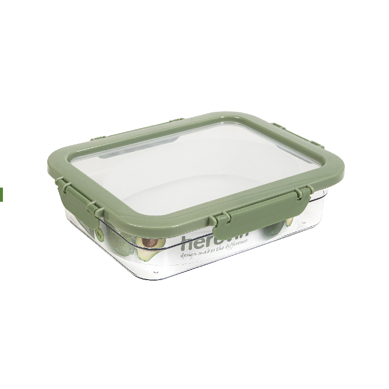 Praktische und zuverlässige Frischhaltebox von HEREVIN mit einem Fassungsvermögen von 1,3 Litern. Hergestellt aus hochwertigem Kunststoff, absolut luftdicht, um Lebensmittel länger frisch zu halten. Der Deckel mit sicherem Verschluss und grüner Dekoration verleiht jeder Küche Komfort und Stil. Es eignet sich zur Aufbewahrung von Müsli, Nudeln, Mehl, Zucker und anderen Produkten.