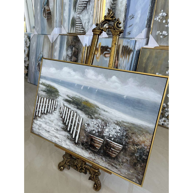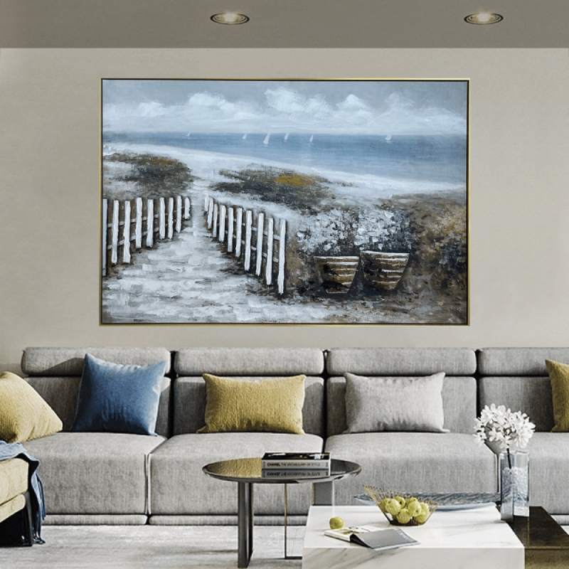 Das Gemälde „Der Weg zum Meer“ stellt eine ruhige und inspirierende Meereslandschaft dar. Im Vordergrund erheben sich mit Grün bedeckte Sanddünen, die den Blick sanft auf das endlose Blau des Meeres lenken. Der Kontrast zwischen dem warmen Beige des Sandes und den kühlen Blautönen erzeugt ein Gefühl von Harmonie und Freiheit.