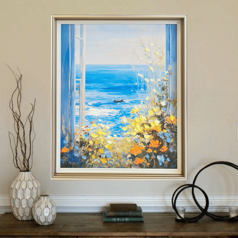„Sea Breeze“ bietet einen Blick durch ein offenes Fenster auf das ruhige Meer und den endlosen Horizont. Eine leichte Brise scheint den Raum zu durchdringen und bringt Frische und Leichtigkeit. Der blaue Himmel und das Meer fließen sanft dahin, und das Sonnenlicht erfüllt die Szene mit Wärme und Behaglichkeit. Das Gemälde vereint Schlichtheit und Eleganz und vermittelt ein Gefühl von Freiheit und Harmonie.