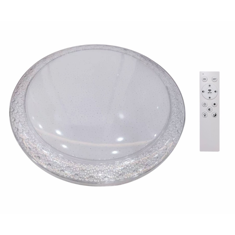 Das Modell verfügt über eine integrierte LED-Lichtquelle mit 64 W Leistung und einem Lichtstrom von 5440 lm, der per Fernbedienung reguliert werden kann. Die Farbtemperatur ist wählbar – von warmweißen 3000 K bis kaltweißen 6500 K. Zusätzlich ist eine Dimmfunktion vorhanden, die eine präzise Helligkeitsanpassung ermöglicht. Die Deckenleuchte ist für den Innenbereich geeignet (Schutzart IP20, Klasse I) und entspricht den europäischen Qualitäts- und Sicherheitsstandards. Sie wird mit einer 24-monatigen Garantie geliefert.