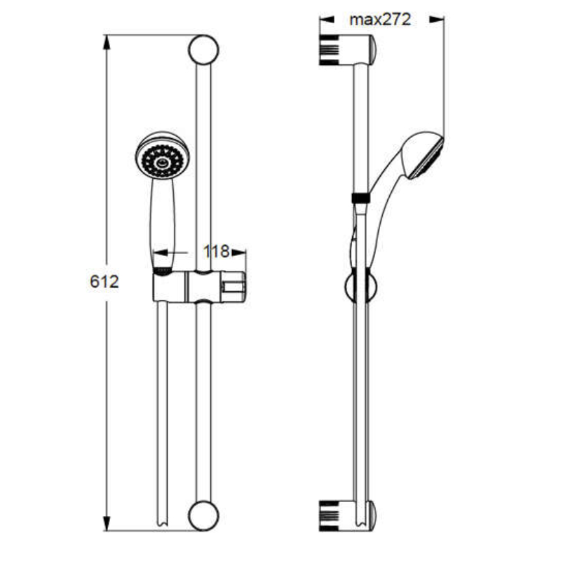 Das System umfasst eine 60 cm lange Rohraufhängung, die eine bequeme Positionierung des Duschkopfs in der gewünschten Höhe ermöglicht. Die Wandmontage gewährleistet Stabilität und Sicherheit während der Benutzung und erleichtert gleichzeitig die Installation.
