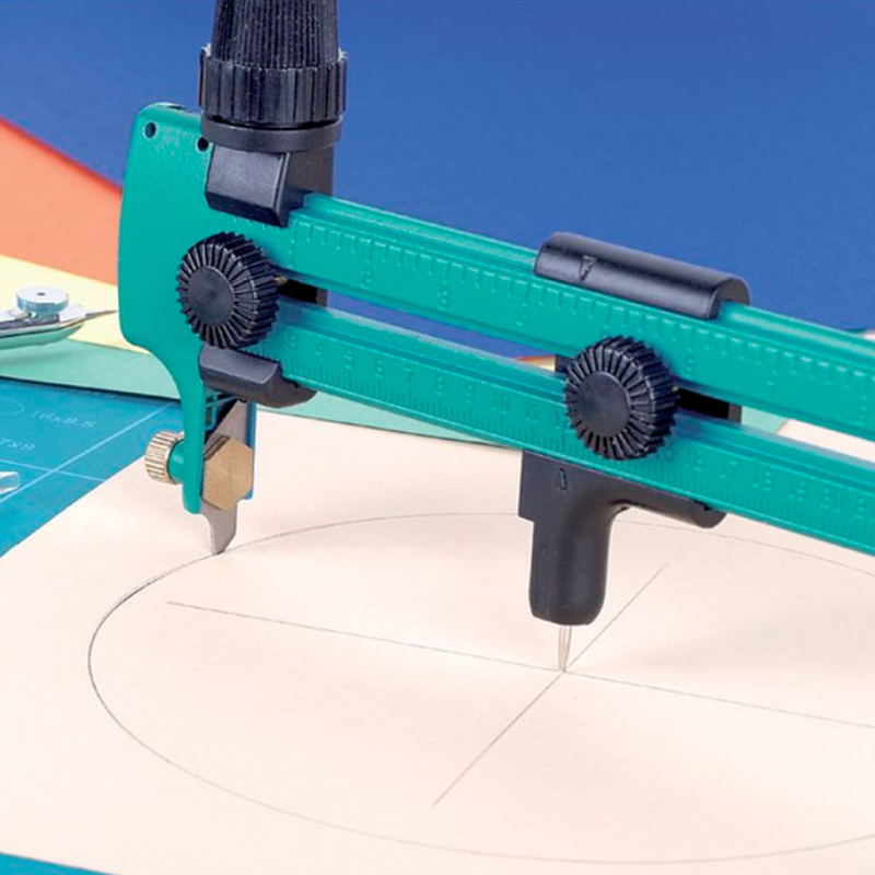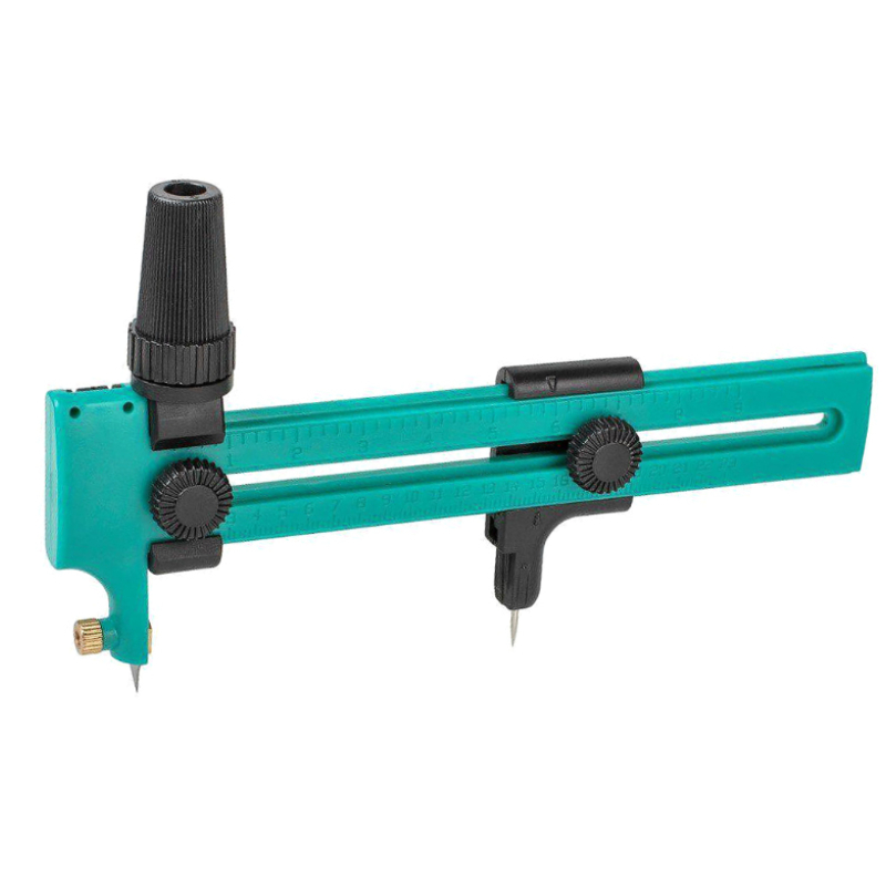 Das Wolfcraft Zirkelmesser ist ein Spezialwerkzeug zum Kreisschneiden von Papier, Folie, Leder, Blech und anderen Materialien mit einem Durchmesser von 40 bis 230 mm. Die Zentriernadel sorgt für einen stabilen Kontakt zum Material und ermöglicht präzise Kreisschnitte. Der Schnittdurchmesser lässt sich einfach durch Verschieben der Zentriernadel entlang der Schiene und Fixieren mit einer Schraube einstellen, wodurch die gewünschte Größe exakt festgelegt werden kann.