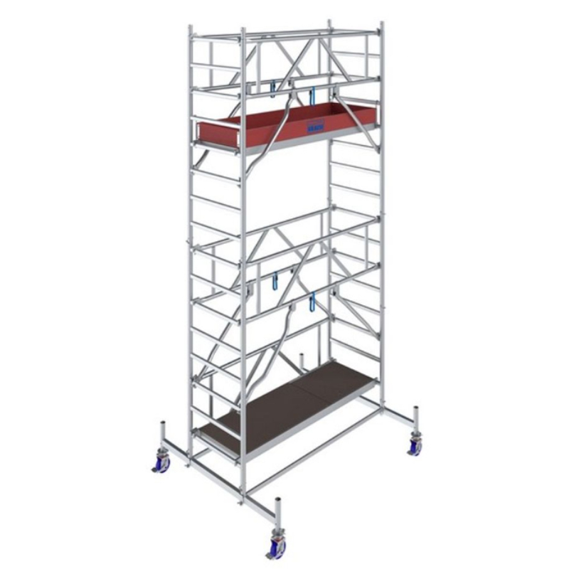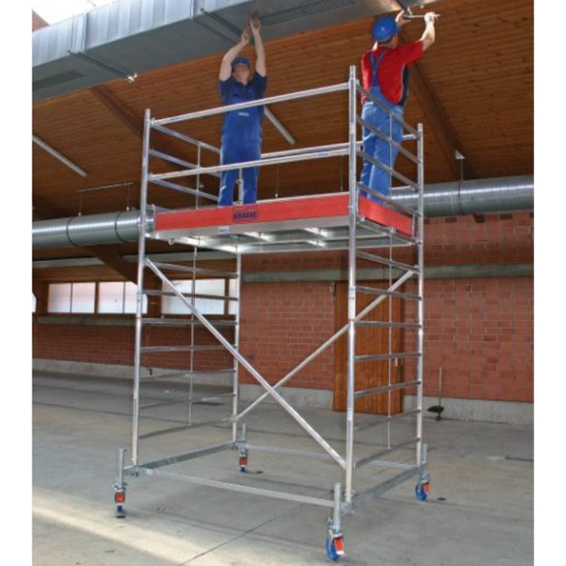 Das Gerüst verfügt über ein Schnellmontagesystem für Geländer und Diagonalen, das die Installation durch eine Person ermöglicht und den Arbeitsprozess erheblich vereinfacht. Verstellbare Räder sorgen für Stabilität auch auf unebenem Untergrund, und robuste Verbindungen verhindern ein ungewolltes Verrutschen oder Anheben der Elemente. Das Gerüst entspricht der europäischen Norm DIN EN 1004 und garantiert somit ein hohes Maß an Sicherheit und Zuverlässigkeit im Betrieb.