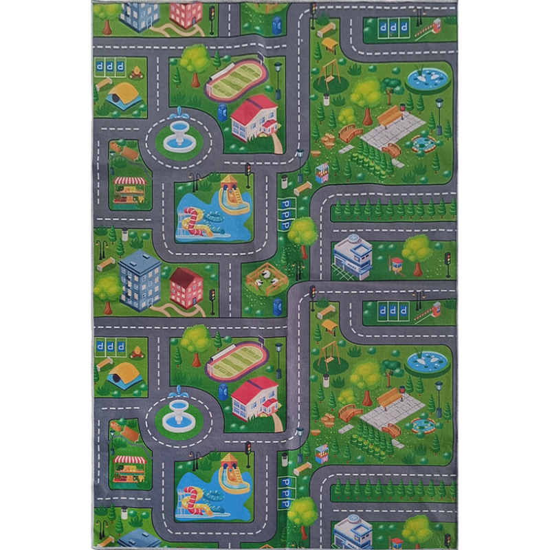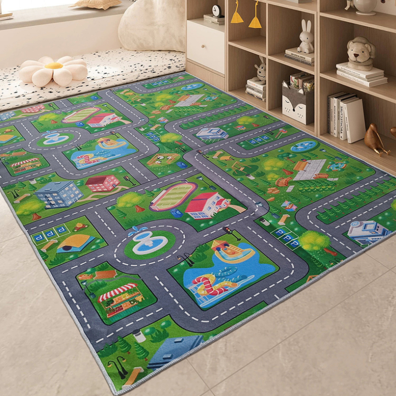Der Teppich aus weichem Polyester fühlt sich angenehm an und bietet Komfort beim Spielen auf dem Boden. Er eignet sich für Jungen und Mädchen gleichermaßen und der grüne Hintergrund verleiht dem Raum Frische und Lebendigkeit.