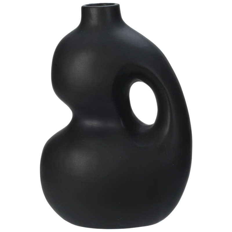 Die dekorative Dolomitvase in Mattschwarz ist ein stilvolles Accessoire für jedes moderne Interieur. Ihre einzigartige asymmetrische Form und die dekorative Öffnung in der Mitte verleihen ihr einen künstlerischen und minimalistischen Charakter. Dank ihres klaren Designs passt sie sowohl zu skandinavischen als auch zu modernen Einrichtungsstilen.