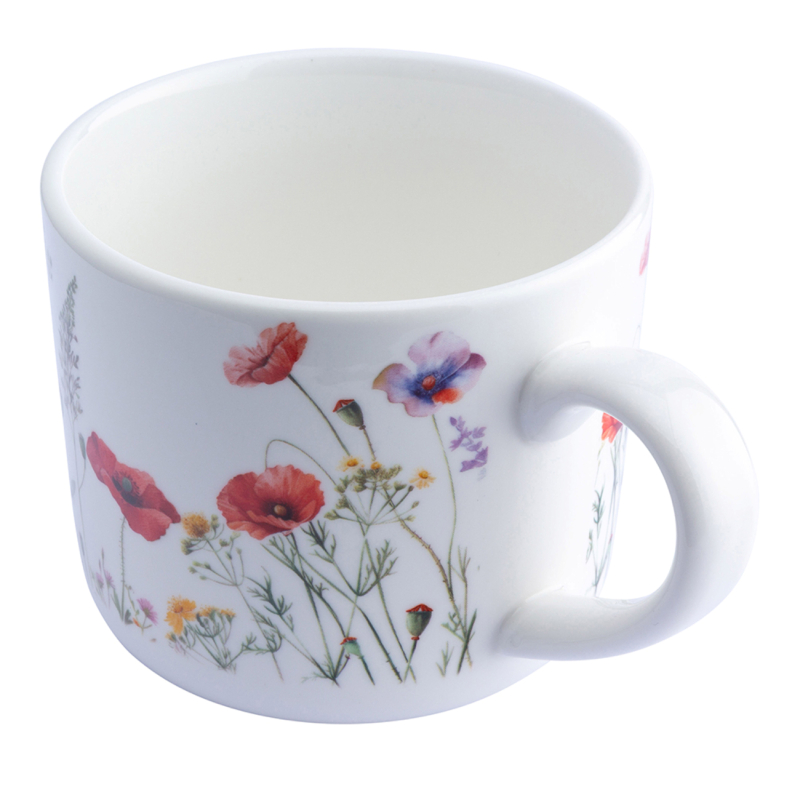 Das florale Motiv mit Mohnblumen, Kornblumen und gelben Wildblumen ist in Aquarelltechnik mit sanften Farbverläufen und feinen Details dargestellt. Die Komposition befindet sich am Tassenboden und erzeugt so den Eindruck, nach oben zu wachsen, wodurch die elegante Form des Porzellans betont wird. Dank ihres großen Volumens eignet sich die Tasse ideal für Tee, Milchkaffee, Kakao und andere Heißgetränke.