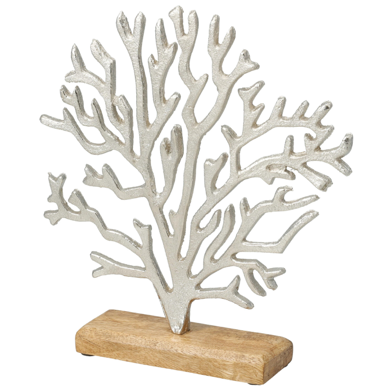 Eine stilvolle, dekorative Skulptur, inspiriert von der Meereswelt und den Formen natürlicher Korallen. Das Metallelement mit seiner markanten Textur bildet die verzweigte Struktur einer Koralle nach und verleiht ihr mit seiner silbernen Oberfläche einen modernen und eleganten Look.
