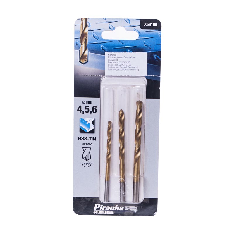 Set of 3 PIRANHA titanium drill bits for metal. The drills are in sizes F4, 5 and 6 mm.